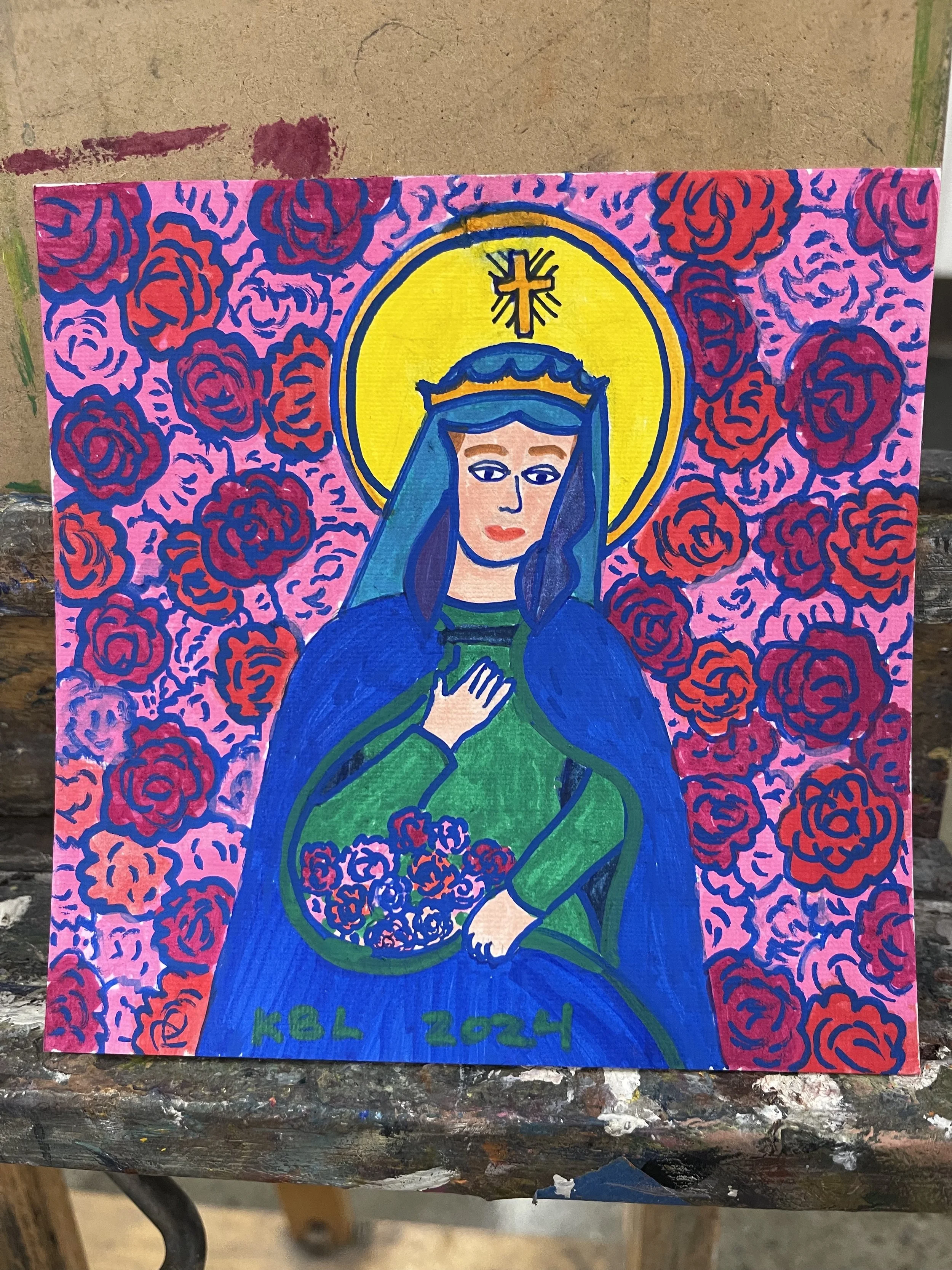 Pasco Acrylic Pen drawing of Elizabeth of Hungary. She was married to a nobleman and lived in a castle. The people in the town below were poor, so she hid bread in her cloak and snuck it out of the castle. Her mean husband caught her in town one day, and things might have gone badly for her, but God turned the bread inside her cloak into roses.