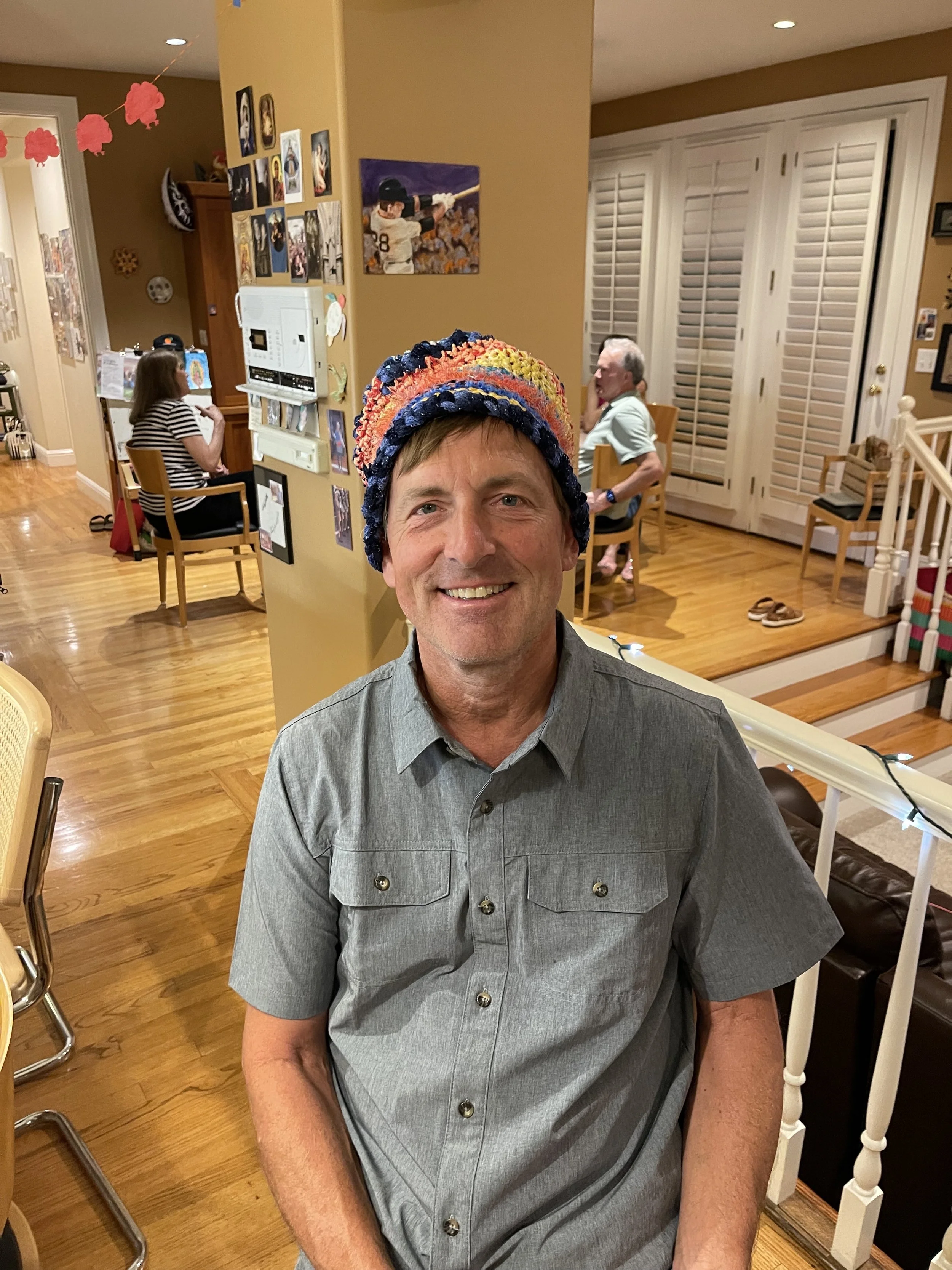The first crazy hat I crocheted was made as a prize for my birthday party White Elephant Bingo Game. Patrick was the lucky winner!
