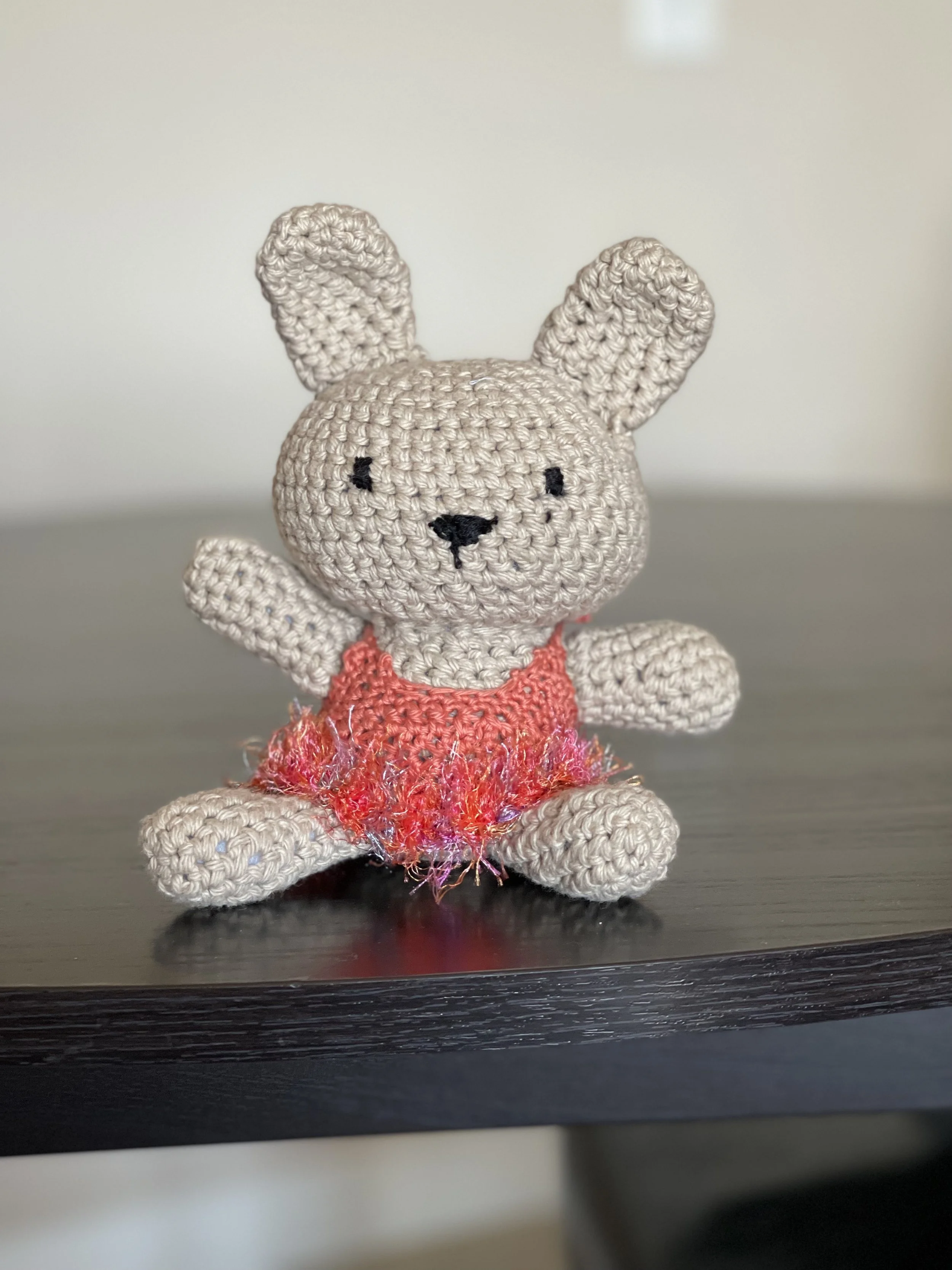 Amigurumi crocheted bunny in a cute little dress. Made for Ellen’s tiny apartment tiny bookshelf.